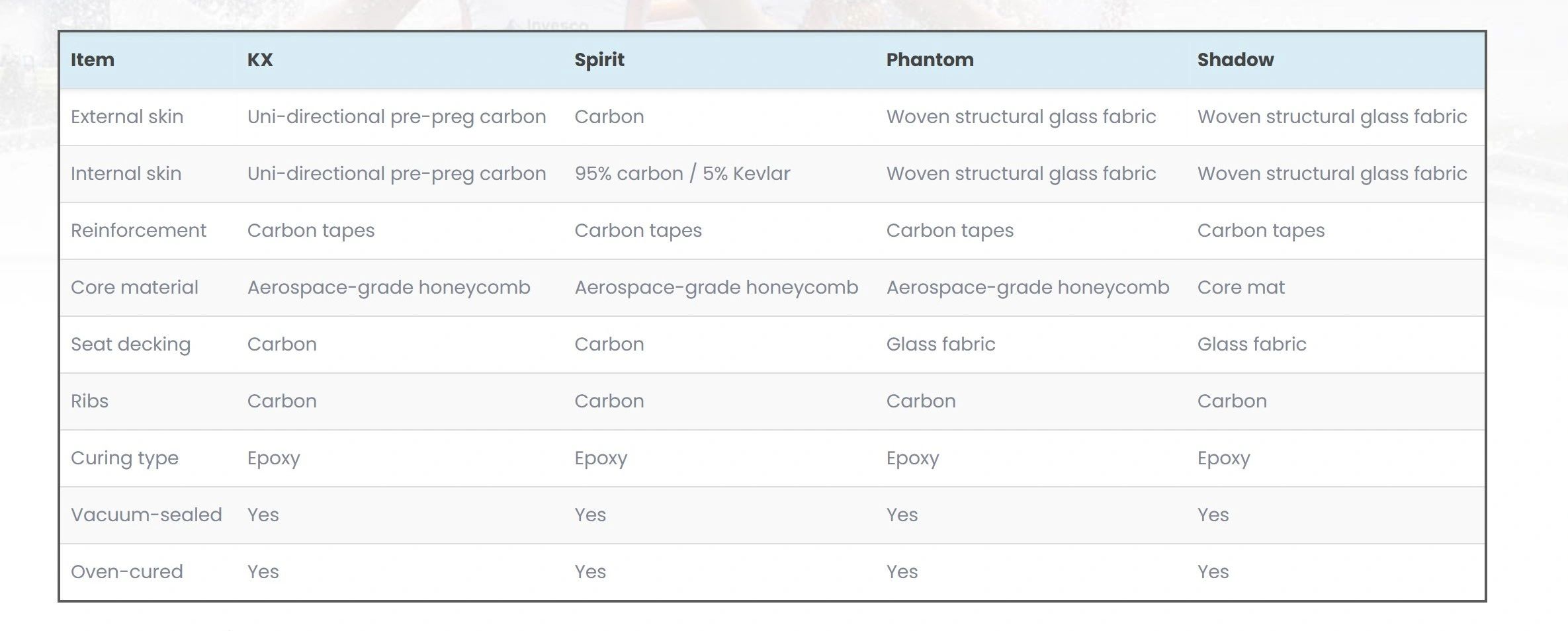 Made of Fiberglass(External skin) + Carbon/Kevlar(Internal skin) + Core Mat(Core) + Carbon/Kevlar (Seat Decking)